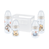 The set contains four NUK Disney Winnie the Pooh First Choice+ Temperature Control baby bottles in polypropylene (PP): two 150ml bottles for smaller appetites and two 300ml bottles. The PP baby bottles are light and durable. The non-slip screw ring makes the bottles easy to open and close while the wide bottle neck makes them simple to fill and clean.