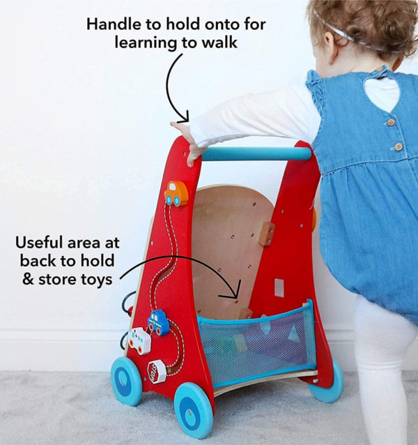 Keep your little one entertained for hours with this multi-activity wooden walker filled with fun, bright and interactive toys. They will be able to turn gears, play the xylophone, develop reflections in the mirror, order shapes, and much more. Whatever stage of development your baby is in, their eyes will light up every time they see this amazing toy, and best of all they will develop their coordination while having fun.