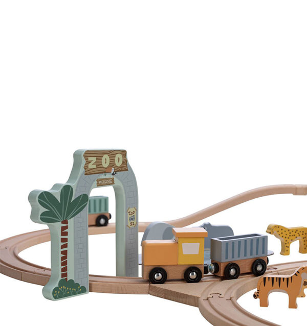 Assemble the wooden train set and take the animal friends on a journey through the jungle. The set includes 25 accessories, making a total of 43 pieces in the set.